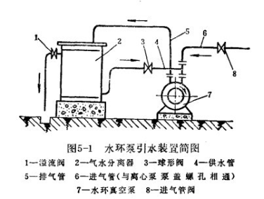 水环式真空泵引水装置如图5-1所示。水环式真空泵的进气管6与水泵泵盖的顶部相连,在没有自来水的地方,必须配置气水分离器,作为真空泵冷却水和补充水的水源。