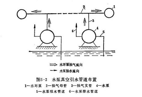 图中供水管4必须与进气管6相接,在运行过程中,气水分离器的水在进气管低压的作用下,沿着管4不断向水环式真空泵内供水。 水环式真空泵真空引水的步骤:首先关闭水泵压力水管中的闸明,向水环式真空泵内注水。注完水后,关闭漏斗上的阀门,并打开进气管上的阀门8及供水管的阀门3,然后开动水环式真空泵。这时,排气管中有水和气的混合物排出.开始时,混合物中气体占主要成份,随后,水的成份越来越多,直到全部为水时,说明水已全部充满了水泵,于是引水完成,可以起动水泵了。再速即关闭进气管上阀8,停止水环式真空泵运行。 如果泵站中有两台以上的水泵,则可将水环式真空泵进气管与抽气母管相通,每台泵的泵壳顶部通过抽气支管与抽气母管相连。在每个支管上都安装一个阀门,以便可以单独对每一台泵抽气。有时,为了备用起见,可以设置两台水环式真空泵,每一台的进气管上都安上阀门。当一台发生故障时,可以关闭该泵上的进气阀门,利用另外一台抽气,不致耽误水泵的起动。正常情况下两台水环式真空泵可对水泵同时抽气,以加快引水速度。整个管路布置如图5-2所示。