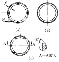 在两个密封环之一的密封端面开有各种沟槽,由于旋转而产生流体动力压力场,引入密封介质做为润滑剂 | 适合于高压介质和高速运转的场合(P。移值达270(MPa·m)/s),往往与流体静压密封组合使用 | |